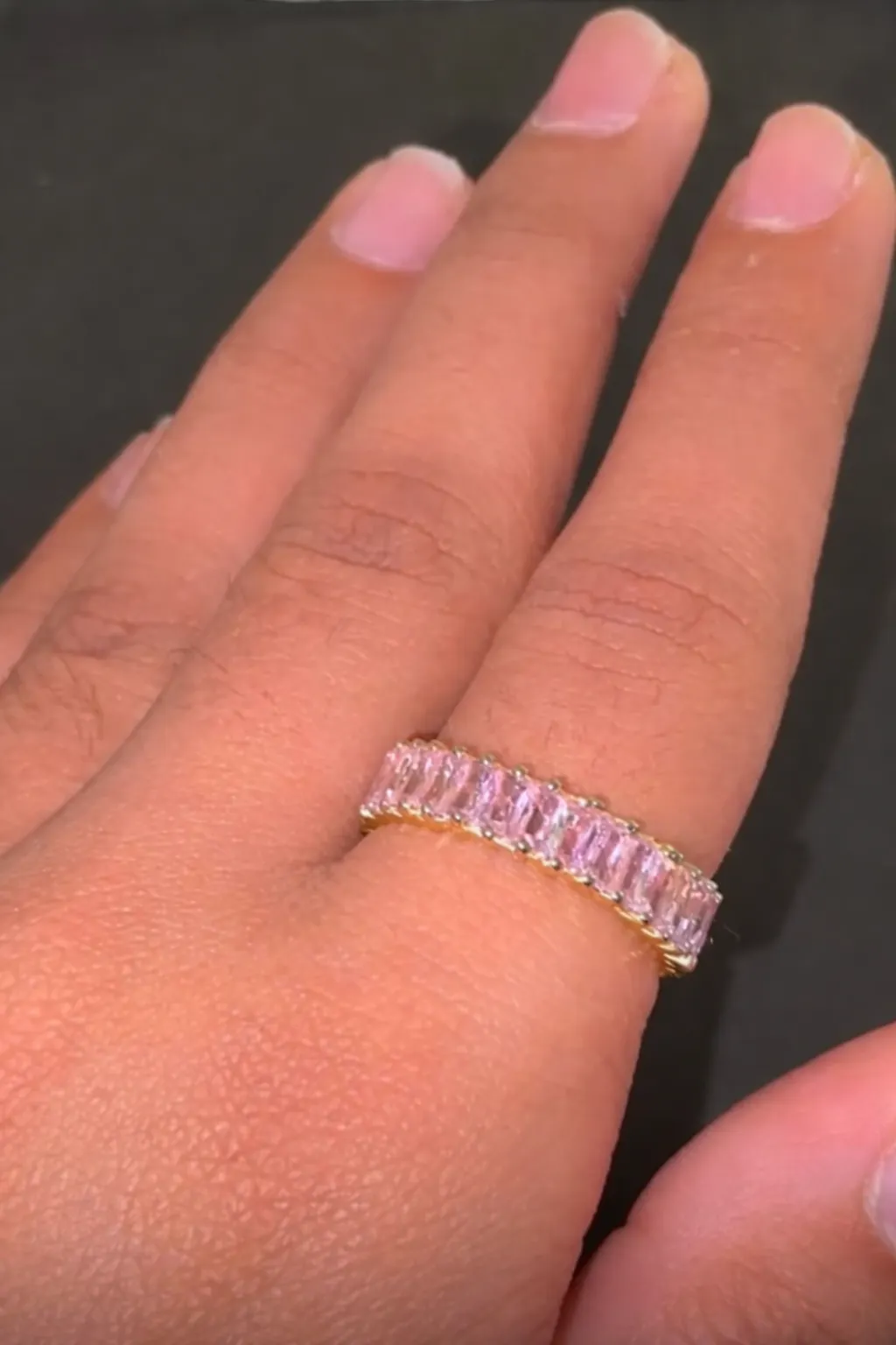 This bold statement ring features a full circle of elongated baguette-cut pink stones, creating a striking, modern silhouette with uninterrupted sparkle. Its geometric profile and luxe shine make it the perfect standout piece for both stacking and solo wear.